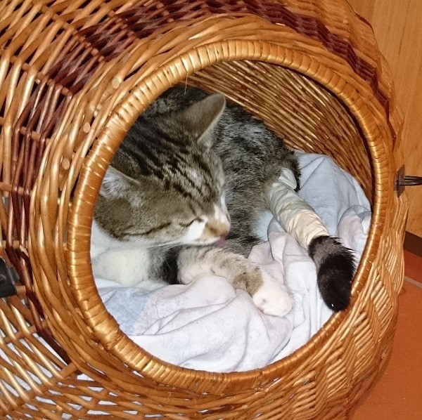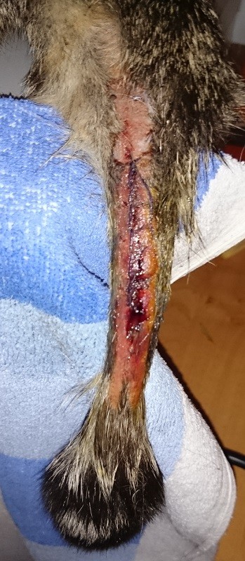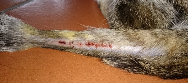 Unsere Katze Jessy hatte einen Unfall. Ein Auto fuhr über ihren Schwanz, der platzte komplett auf.