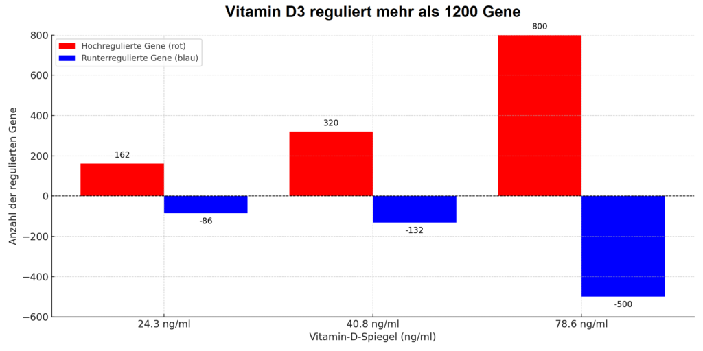 Vitamin D3 aktiviert mehr als 1.200 Gene, darunter solche, die die Immunantwort, Zellteilung und Entzündungsregulation steuern. Ausreichende D3-Spiegel fördern: